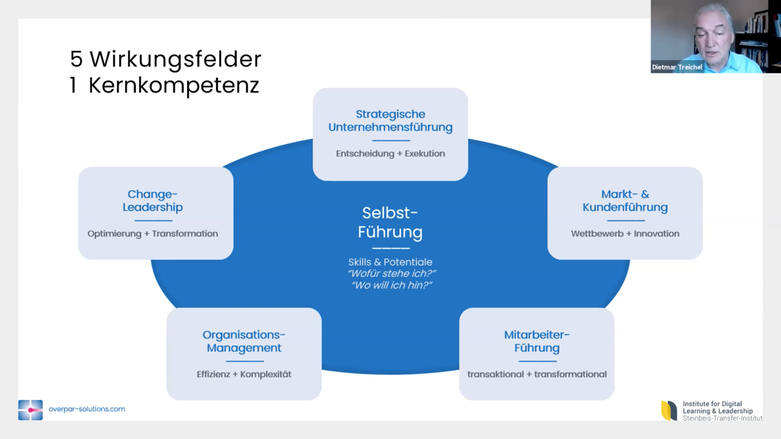 Für Führungspersonen bedeutet eine veränderung der Arbeitsweise, dass auch sie sich weiterentwickeln können. So liegt der Fokus der Führung eines agilen selbstorganisierten Teams oder Bereichs darin, die Rahmenbedingungen so zu gestalten, dass die Selbstorganisation möglichst effizient funktioniert. Dabei hat sich herausgestellt, dass die Selbst-Führung zentral ist. Also die eigenen Skills und Potentiale. Ausgehend davon kann man fünf Wirkungsfelder unterscheiden, mit denen sich Führungskräfte beschäftigen sollten.